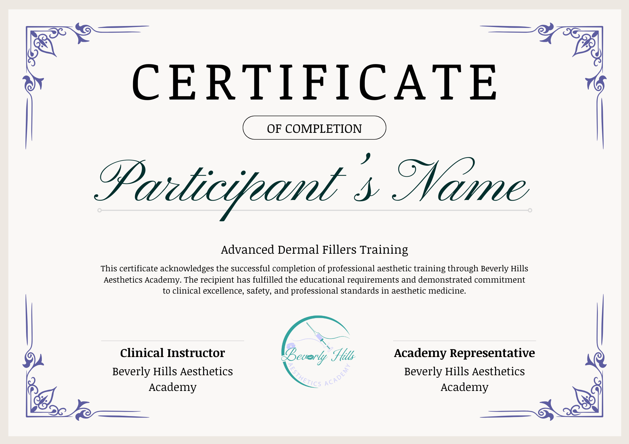 This Certificate of Completion confirms successful participation in Advanced Dermal Fillers training at Beverly Hills Beauty Academy. The course emphasizes advanced concepts, precision, and thoughtful treatment planning.